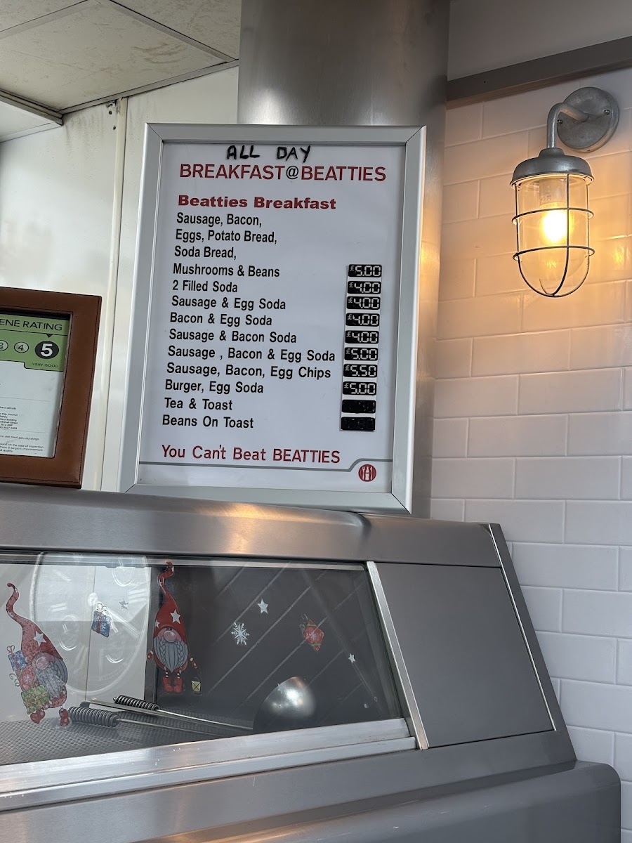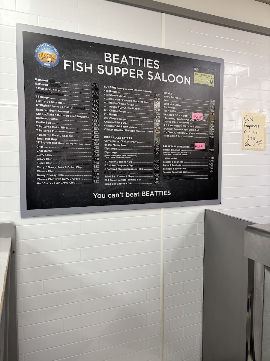 From a reviewer’s perspective, the menu at Beatties Fish & Chip Shop offers a straightforward, satisfying selection that covers classic takeaway favourites and quick comfort foods. The burger range includes the 4oz Burger, 4oz Cheese Burger, 4oz Hawaiian Pineapple Thousand Island, 4oz Bacon Cheese Burger, and 4oz Bacon, Egg Cheese Burger, giving customers a variety of hearty options. The sides and extras such as 4 Chicken Goujons + Dip, 6 Chicken Goujons + Dip, Dips Small, Dips Large, and Salad Bap Cheese + Mayo add flexibility for lighter bites or add-ons. Traditional chip shop items like Battered, 7 Fish Bite's + Dip, 1 Sausage, 1 Battered Sausage, and Battered Beef Steakette reinforce the classic fish and chip shop experience, while the Beattie Breakfast provides a filling start to the day. Drinks are simple and practical, including 500ml Bottles, Small Kids Drinks, 2ltr Bottles, and Tea, rounding out a menu that focuses on familiar, comforting takeaway choices rather than an overly complicated selection.